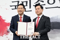 김승수 위원장·배준영 부위원장 "공권력 동원한 與 가짜뉴스 체계적 대응" 장동혁 국민의힘 대표(왼쪽)가 5일 오전 서울 여의도 국회에서 열린 '야당탄압가짜뉴스감시특별위원회 임명장 수여식 및 제1차 전체회의'에서 김승수 의원에게 임명장을 수여한 뒤 기념촬영을 하고 있다./국회=남용희 기자[더팩..